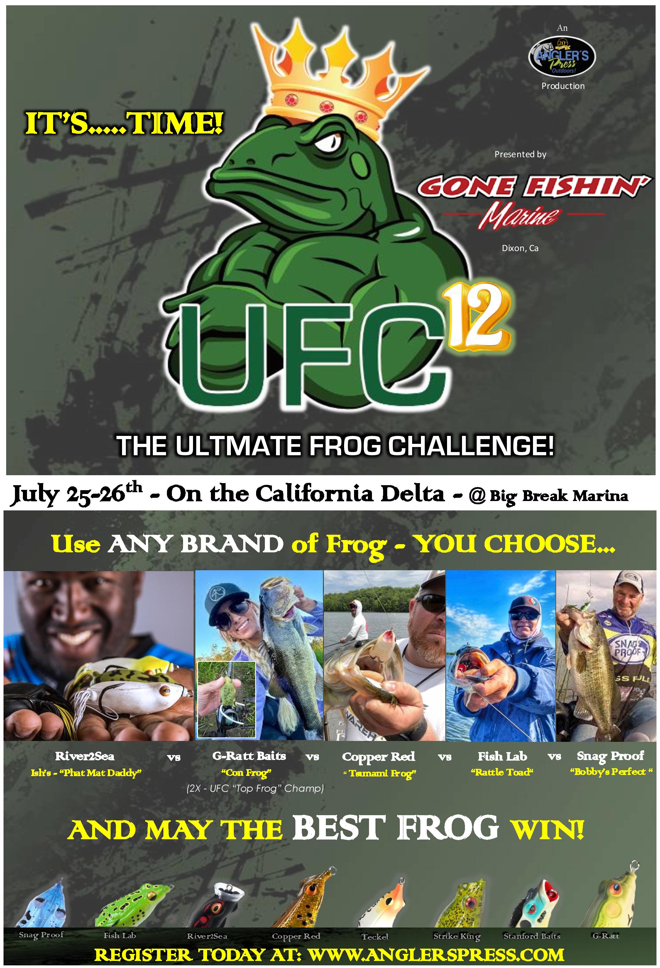Feelin froggy? Then leap into what has become THE FROG TOURNAMENT, as competitors battle it out on the world-famous California delta USING ANY BRAND OF TOP WATER FROG THEY CHOOSE!
